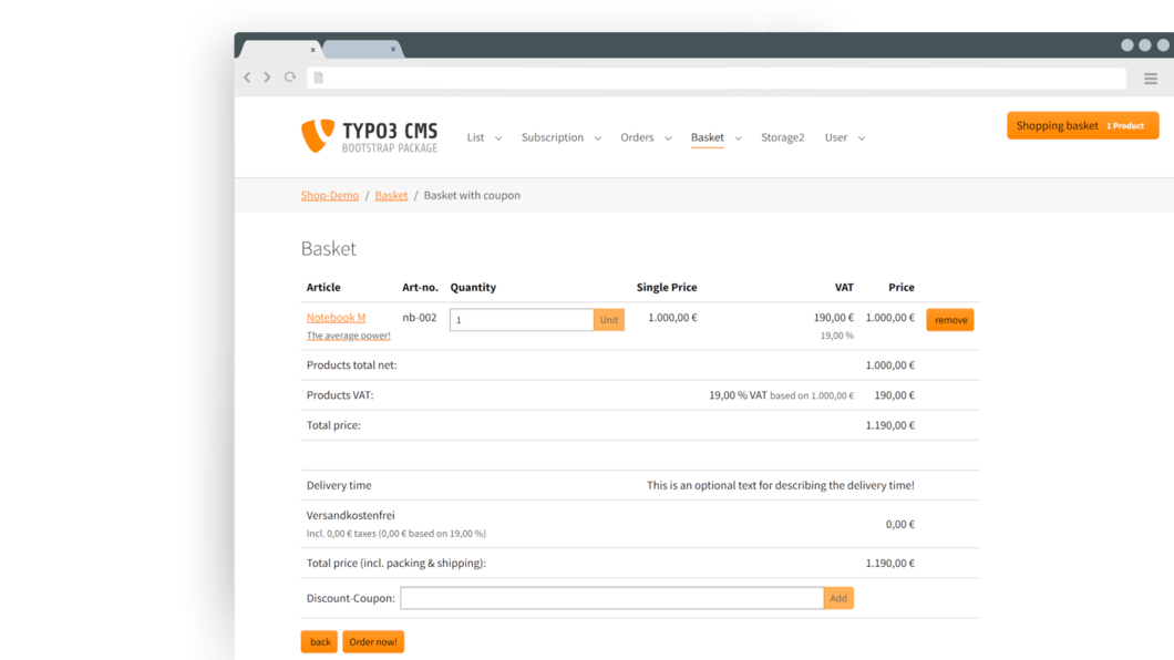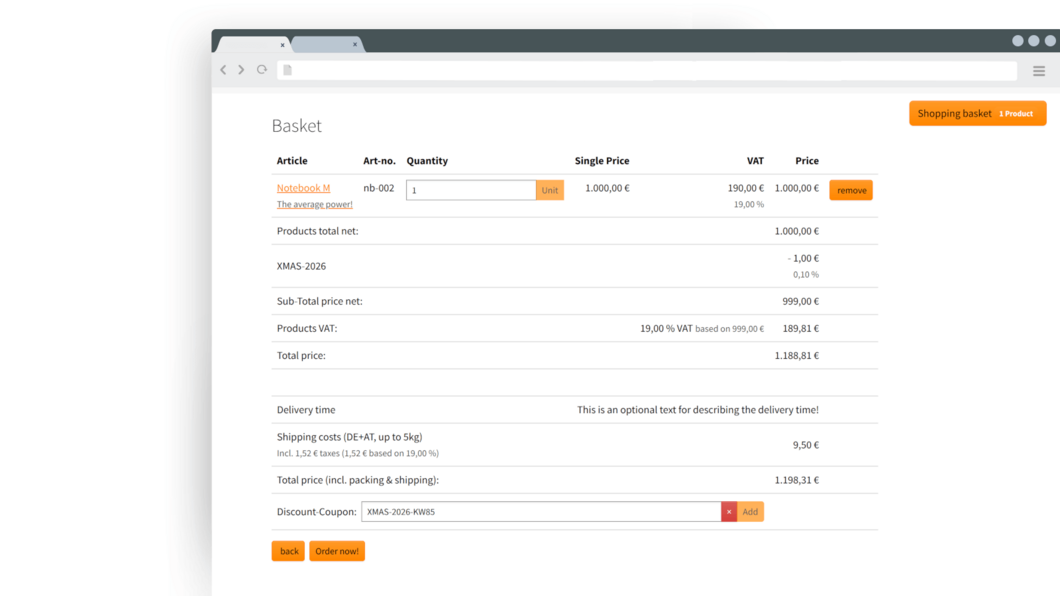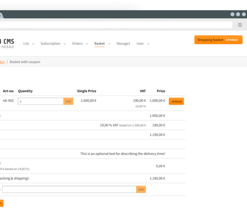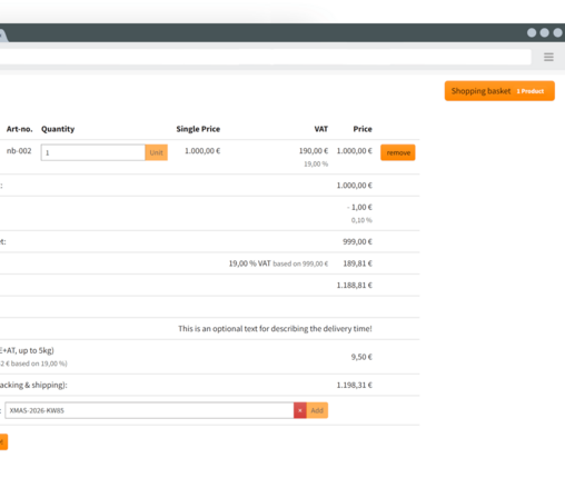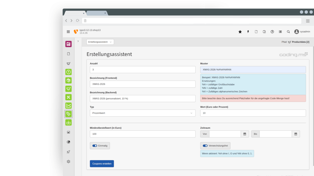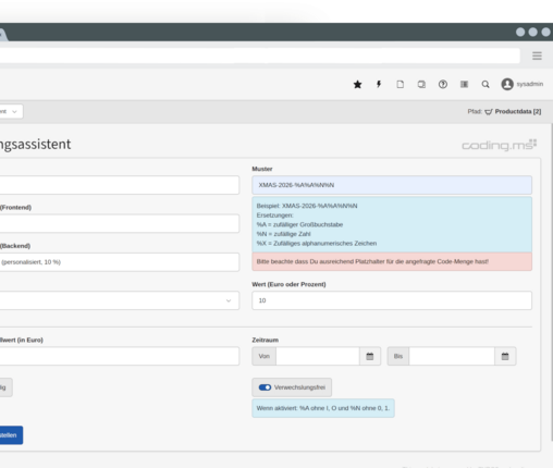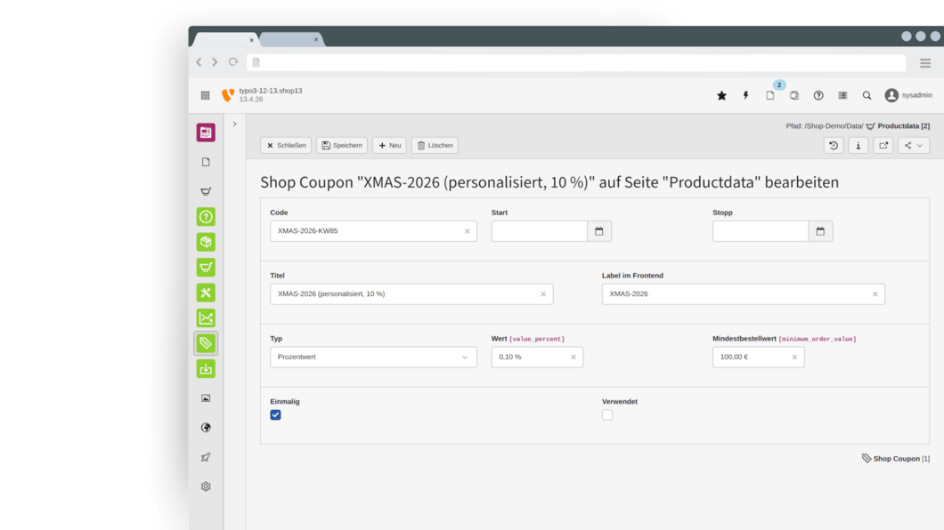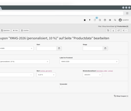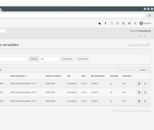 The Shop Coupon Extension for TYPO3 enhances our TYPO3 shop extension with professional coupon and discount features for checkout and order processing. You can use coupon codes flexibly to offer percentage-based or fixed discounts, run campaigns in a structured way, and provide attractive promotions to your customers directly in the ordering process. In addition, you can control validity and usage conditions precisely through rules—for example with time periods, minimum order values, or one-time redeemable codes—allowing you to reliably implement both simple discount campaigns and more advanced promotion logic.