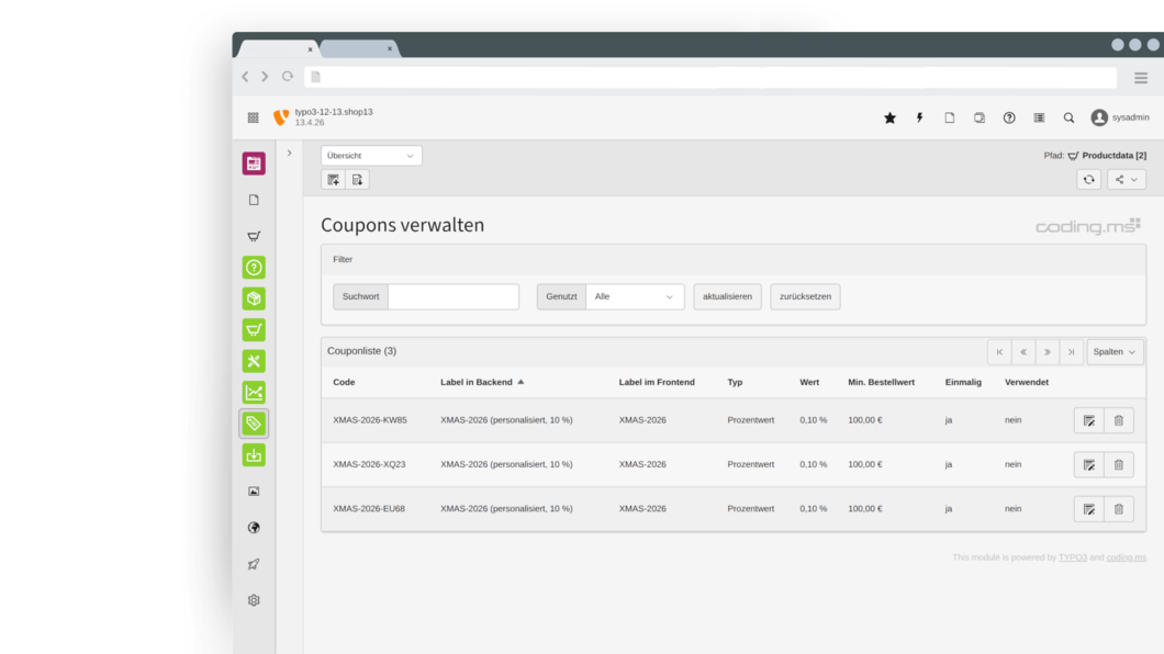 - This extension provides an coupon features for the TYPO3 Shop extension.